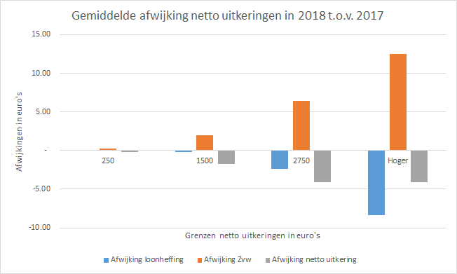 Deze achteruitgang komt voornamelijk door de verhoging van de bijdrage voor de Zorgverzekeringswet (Zvw) van 5,40% naar 5,65%. Gepensioneerden met een netto pensioen tussen de 1.700 en 2.650 euro profiteren nog wel van een verlenging van de eerste belastingschijf. Hierdoor wordt er iets minder belasting per maand ingehouden op het bruto pensioen.